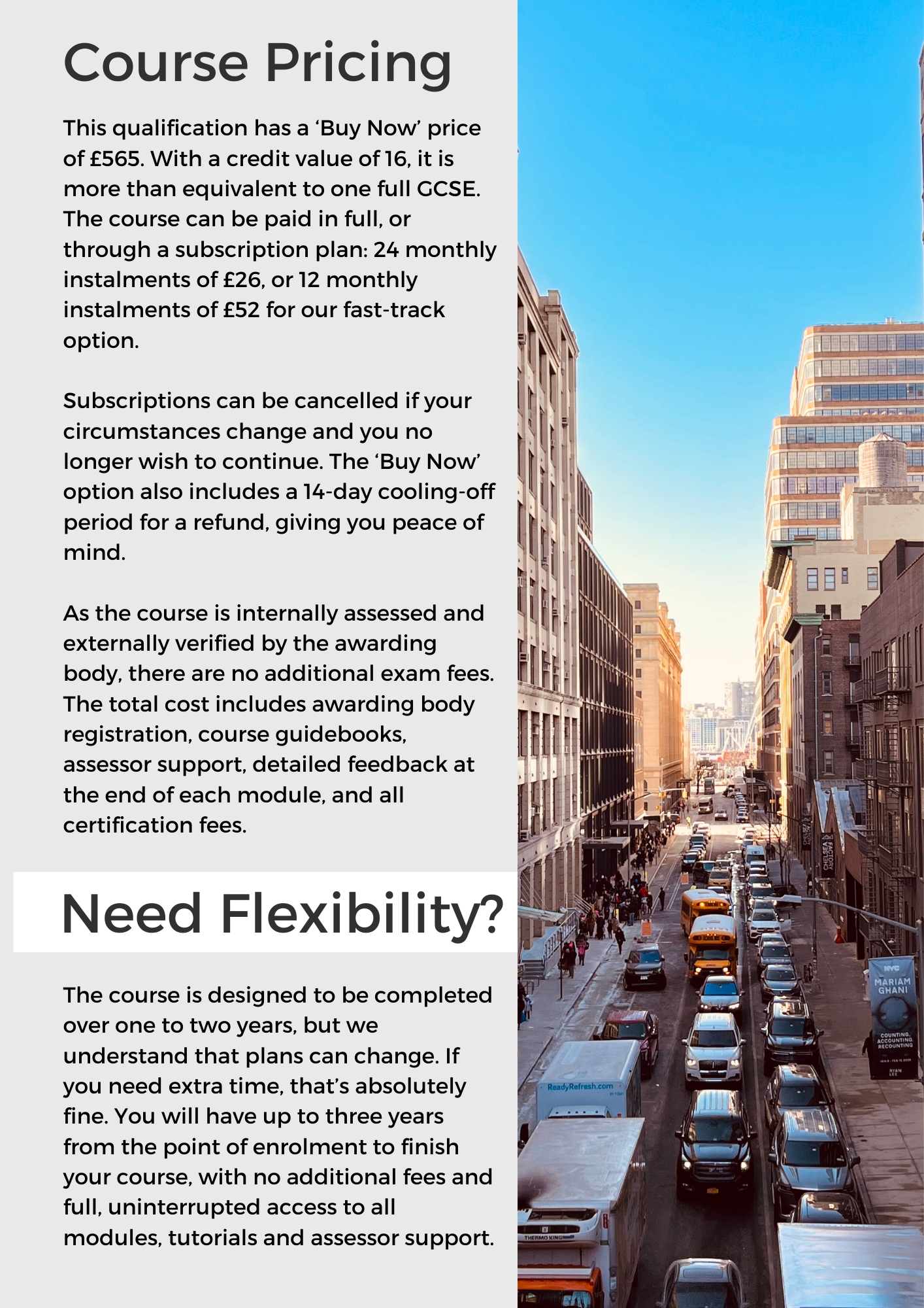 - Total cost: £565 ‘one off’ payment or a monthly subscription of 24 instalments of £25 or 10 instalments of £60.