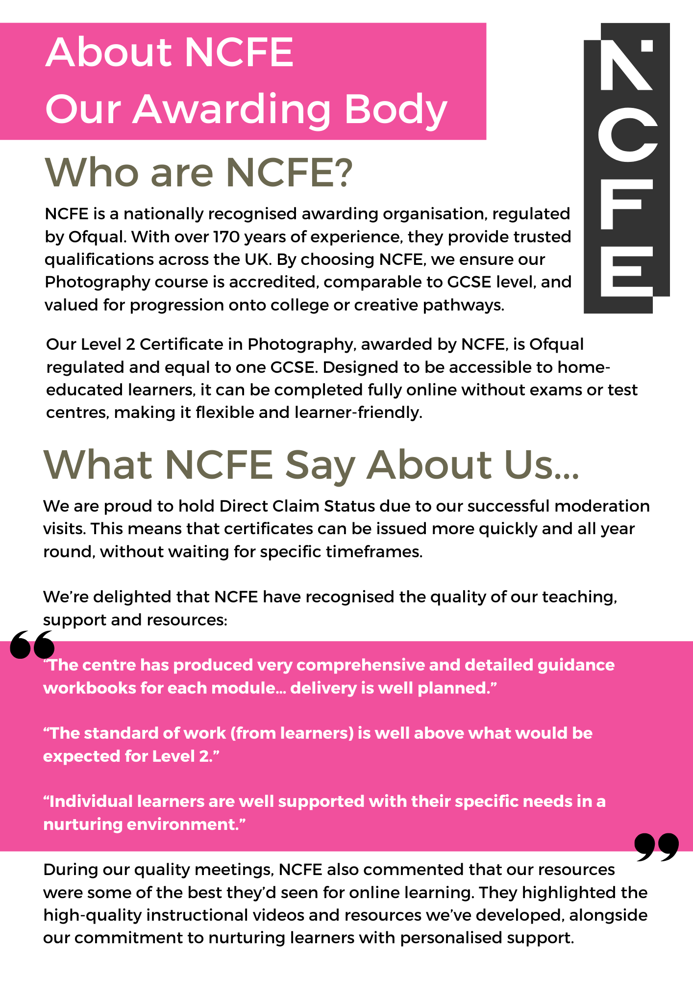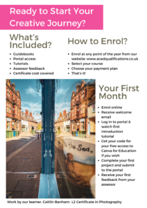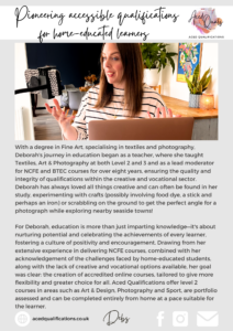 We offer complete flexibility in our approach, removing the barriers creative, home educated learners face. No exam, no controlled assessment and no stressful trips to exam centres are required, enabling learners the chance to achieve nationally accredited courses from home. Learners can work at their own pace without the added anxiety attached to fixed deadlines and timetabled exam dates.