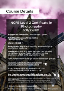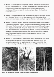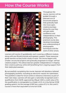 Additionally, the course will equip the learner will key skills to develop a portfolio of photography work.