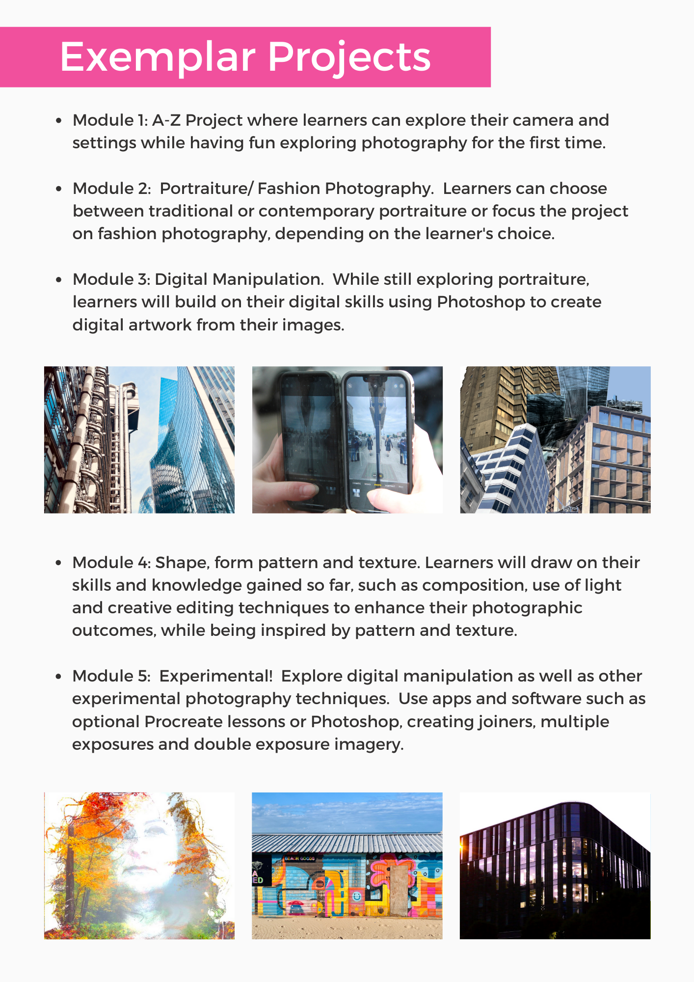 Throughout this course, learners will develop a comprehensive understanding and practical skills in a range of photography techniques, including: